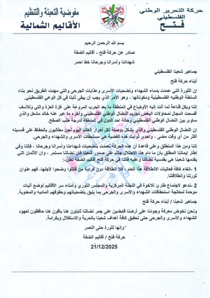 بيان صادر عن حركة التحرير الوطني الفلسطيني فتح – أقاليم الضفة الغربية: