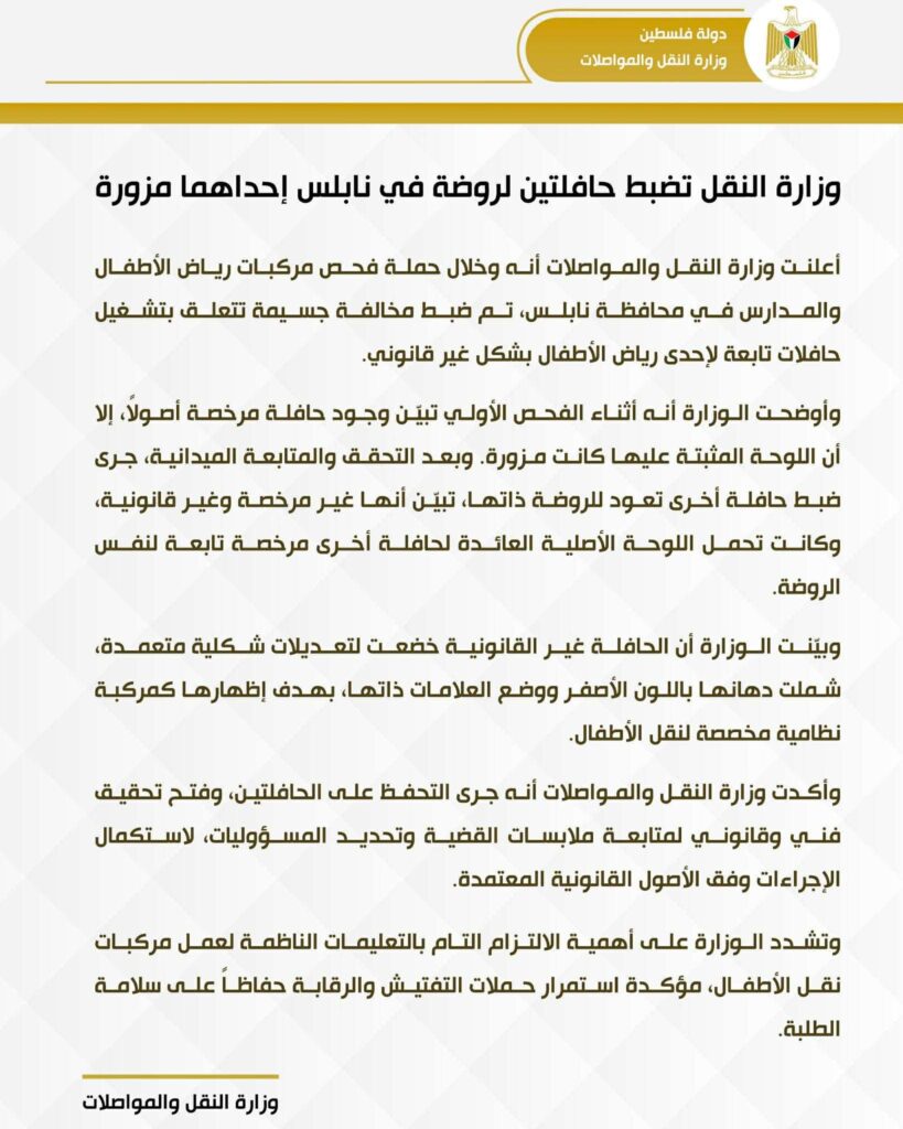 أعلنت وزارة النقل والمواصلات أنه وخلال حملة فحص مركبات رياض الأطفال والمدارس في محافظة نابلس، تم ضبط مخالفة جسيمة تتعلق بتشغيل حافلات تابعة لإحدى رياض الأطفال بشكل غير قانوني.
