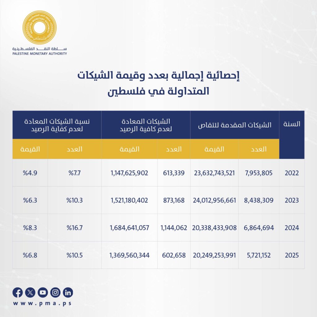 كشفت سلطة النقد إحصائية سنوية حول الشيكات المتداولة في فلسطين للعام 2025، أظهرت تداول 5.7 مليون شيك بقيمة إجمالية بلغت 20.25 مليار دولار، أعيد منها لعدم كفاية الرصيد 602 ألف شيك بقيمة 1.37 مليار دولار، ما يشكل 10.5% من حيث العدد و6.8% من حيث القيمة .