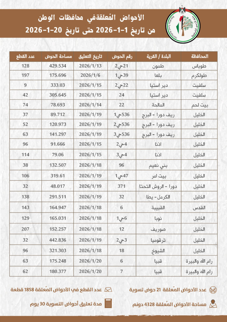 وأوضحت سلطة الأراضي في بيان، اليوم الأربعاء، أن الأحواض المعلّقة تبلغ مساحتها الإجمالية 4238 دونما، وتضم 1858 قطعة أرض، وتشمل محافظات: الخليل، ورام الله والبيرة، وطولكرم، وسلفيت، وبيت لحم، والقدس المحتلة، وطوباس.