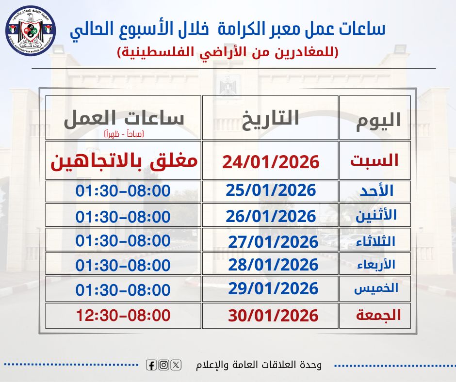 ساعات عمل معبر الكرامة خلال الأسبوع الجاري