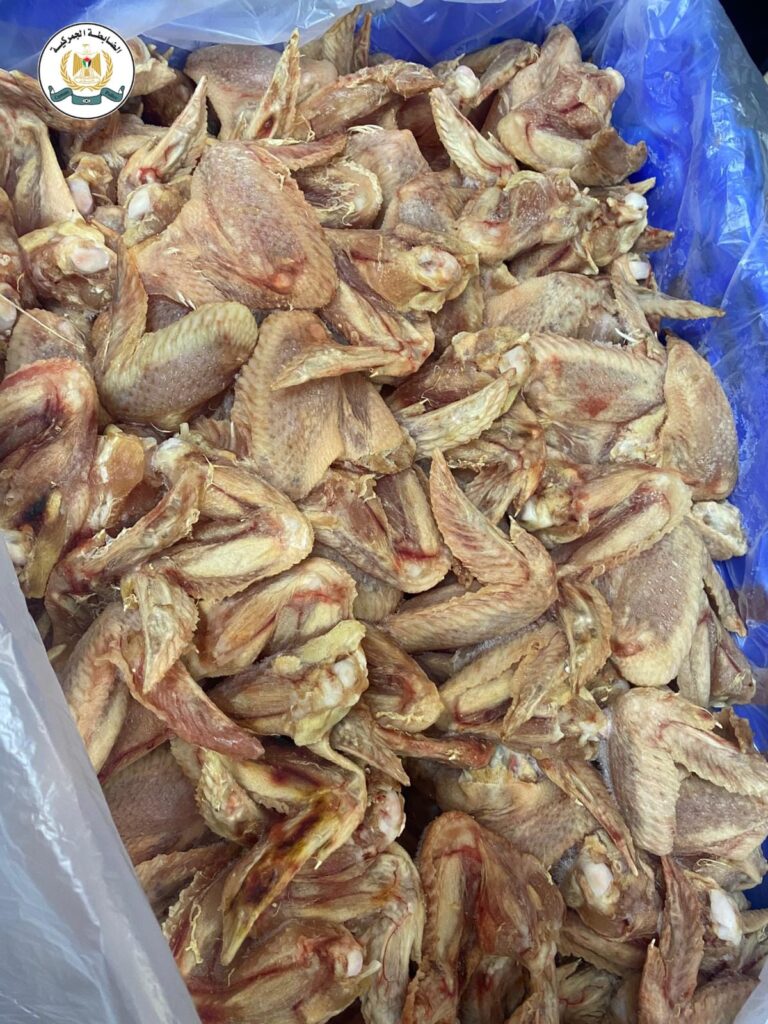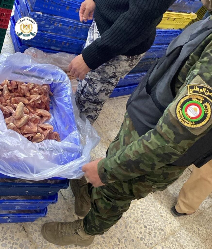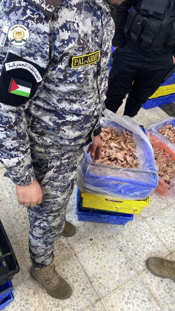 ضبط جهازي الضابطة الجمركية والأمن الوقائي، بإسناد من جهازي الشرطة والأمن الوطني، وبالتعاون مع محافظة الخليل وجهة الاختصاص في الاقتصاد الوطني والصحة وقسم البيطرة في الخليل، اليوم الإثنين، داخل أحد المخازن في الخليل، حوالي 2 طن لحوم دجاج مجمدة غير صالحة للاستهلاك الآدمي؛ نتيجة لظهور علامات تدل على فسادها وانبعاث روائح نتنه منها وسوء التخزين، حيث أن تناولها قد ينجم عنه مخاطر صحية كبيرة على المستهلكين.