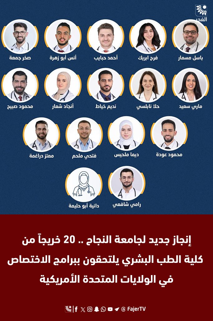 إنجاز جديد لجامعة النجاح .. 20 خريجاً من كلية الطب البشري يلتحقون ببرامج الاختصاص في الولايات المتحدة الأمريكية