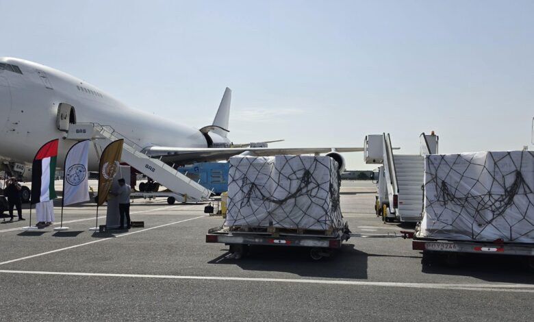 بدعم من وكالة الإمارات للمساعدات وبتوجيهات من حاكم عجمان .. طائرة إغاثة لغزة تحمل على متنها أطنان من المساعدات الغذائية