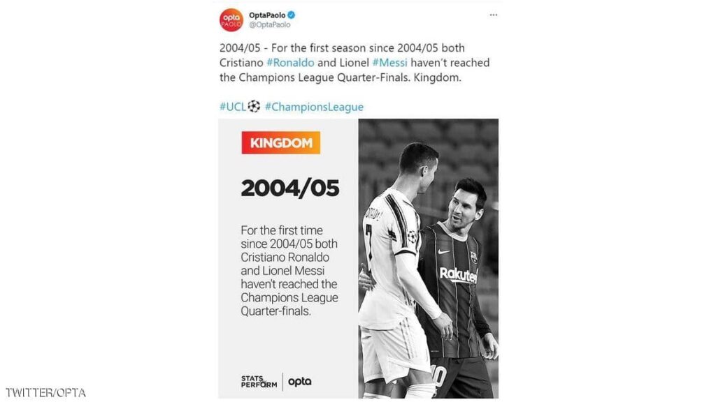 ووفقا لما ذكرته شبكة “أوبتا” للإحصائيات في تغريدة لها على حسابها في موقع تويتر، فإن هذه هي المرة الأولى التي يغيب فيها اللاعبان ميسي ورونالدو معا عن منافسات ربع نهائي بطولة دوري أبطال أوروبا منذ ما يزيد على 16 عاما، أي منذ بطولة التشامبيونزليغ لموسم 2004/2005.