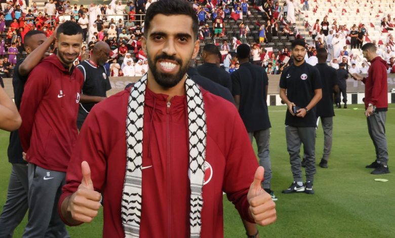 توشح كابتن منتخب منتخب قطر الأول لكرة القدم حسن الهيدوس الكوفية الفلسطينية، خلال التدريبات التي جرت بالدوحة، في لفتة تدل على التضامن مع القضية الفلسطينية.