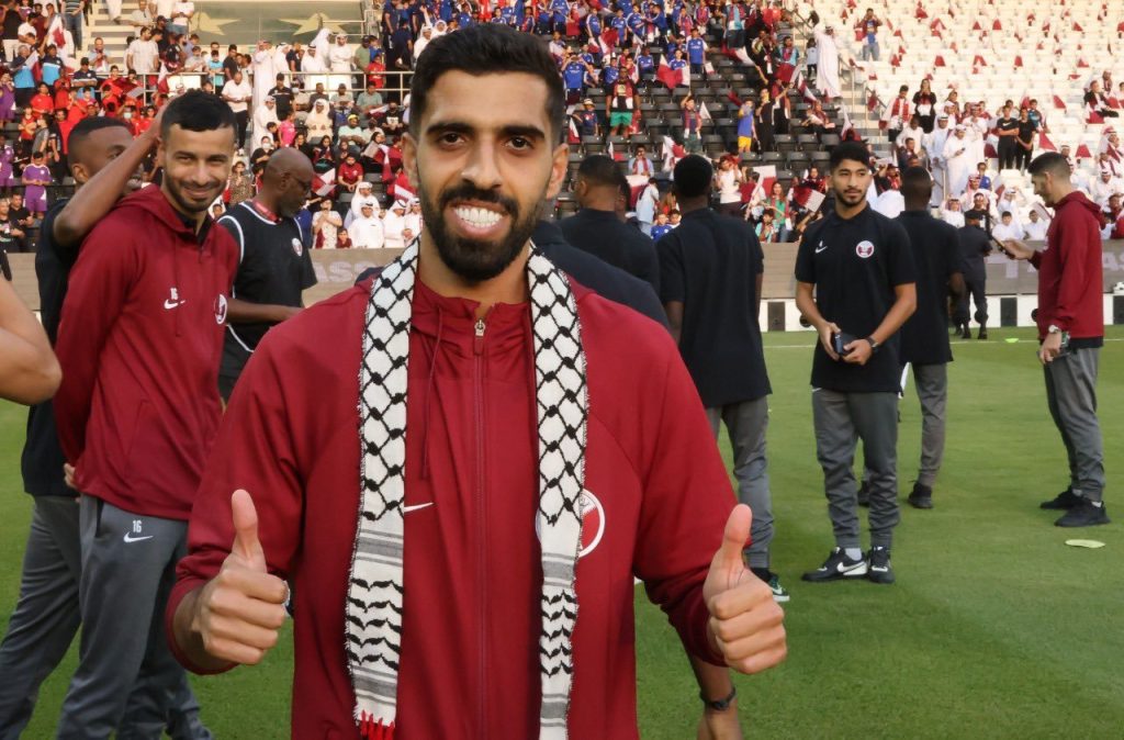 توشح كابتن منتخب منتخب قطر الأول لكرة القدم حسن الهيدوس الكوفية الفلسطينية، خلال التدريبات التي جرت بالدوحة، في لفتة تدل على التضامن مع القضية الفلسطينية.