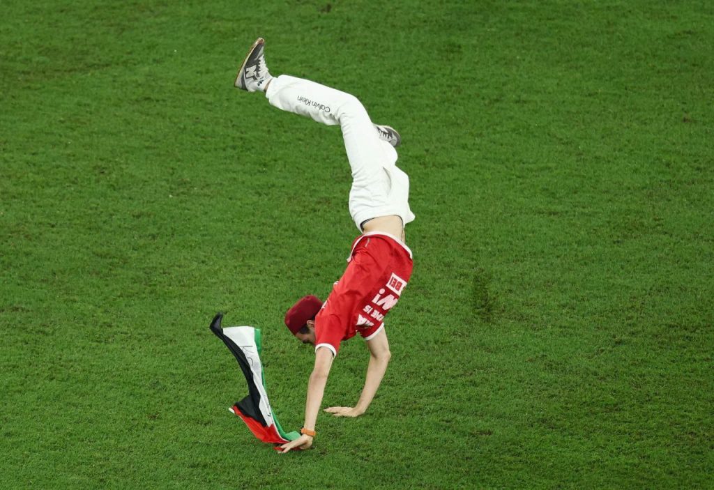 وحمل المشجع العلم الفلسطيني وقام بحركات أكروباتية قبل أن يتم القبض عليه.
