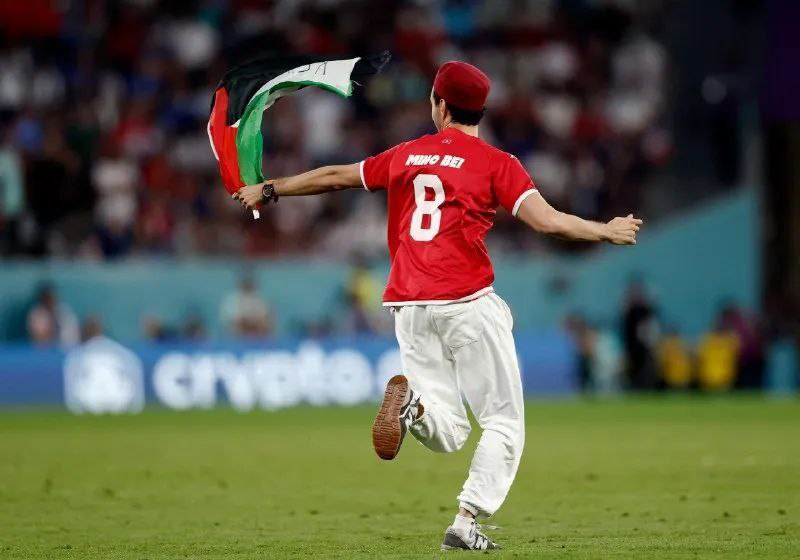 وحمل المشجع العلم الفلسطيني وقام بحركات أكروباتية قبل أن يتم القبض عليه.