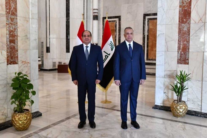 وصول اليوم السبت، الرئيس المصري عبد الفتاح السيسي إلى مطار بغداد الدولي، وكان في استقباله رئيس الحكومة العراقية مصطفى الكاظمي.