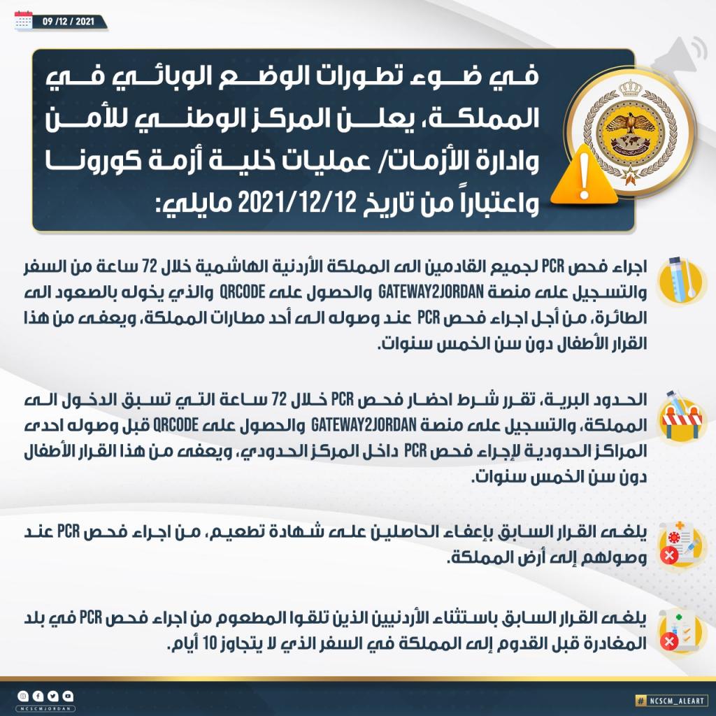 وبين المركز أنه تم إلغاء القرار السابق بإعفاء الحاصلين على شهادة تطعيم من إجراء فحص PCR عند وصولهم أرض المملكة، وإلغاء القرار السابق باستثناء الأردنيين الذين تلقوا المطعوم من إجراء فحص PCR في بلد المغادرة قبل القدوم إلى المملكة في السفر الذي لا يتجاوز 10 أيام.