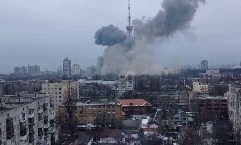 وانقطع بث التلفزيون الأوكراني عقب قصفه مباشرة، وبالتزامن استهدف صاروخ روسي برجا للاتصالات في العاصمة الأوكرانية.