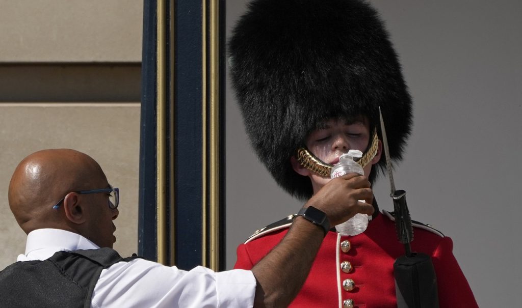 A police officer givers water to a British soldier wearing a traditional bearskin hat, on guard duty outside Buckingham Palace, during hot weather in London, Monday, July 18, 2022. The British government have issued their first-ever "red" warning for extreme heat. The alert covers large parts of England on Monday and Tuesday, when temperatures may reach 40 degrees Celsius (104 Fahrenheit) for the first time, posing a risk of serious illness and even death among healthy people, the U.K. Met Office, the country's weather service, said Friday. (AP Photo/Matt Dunham)