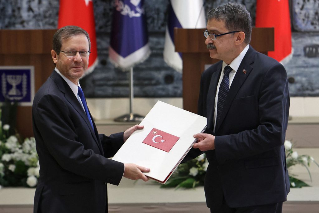 وقال هرتسوغ بعد مراسم أُقيمت في مقرّ إقامته في القدس، “اليوم نستكمل خطوة مهمة، نصل إلى حدث آخر مهم في تعزيز علاقاتنا وتعميق الصداقة بين تركيا وإسرائيل”، وفق ما جاء في بيان.