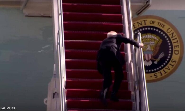 وأظهر مقطع فيديو سقوط الرئيس الأميركي، 3 مرات متتالية، أثناء صعوده درجات السلم المؤدي إلى طائرة “إير فورس ون”، الجمعة، المتجهة إلى أتلانتا من جوينت بيس أندروز في ماريلاند.