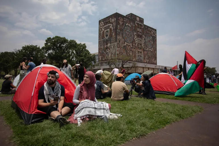 في المكسيك، نصب عشرات الطلاب والناشطين المؤيّدين للفلسطينيين خياما أمام جامعة المكسيك الوطنية المستقلّة، ووضع الطلاب فوق مخيّمهم الاحتجاجي أعلاما فلسطينية وردّدوا شعارات من بينها “عاشت فلسطين حرّة”، و”من النهر إلى البحر، فلسطين ستنتصر”.