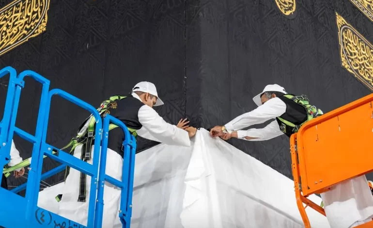 وقالت الهيئة في منشور بحسابها على منصة “إكس” إن “رفع كسوة الكعبة بدأ بالجزء السفلي بمقدار 3 أمتار، وتغطية الجزء المرفوع بإزار من القماش القطني الأبيض بعرض 2.5 متر وطول 54 مترا من الجهات الأربع للكعبة المشرفة، وفك 3 من القناديل، ثم تثبيت القماش الأبيض على جميع الجهات، كل على حدة”.