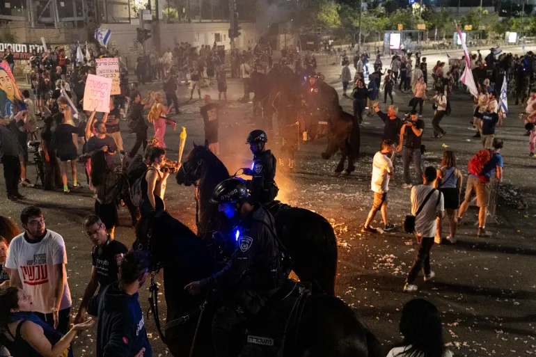 شارك عشرات آلاف الإسرائيليين في مسيرة ليل السبت وسط تل أبيب للمطالبة بالتوصل إلى اتفاق لوقف إطلاق النار مع حركة المقاومة الإسلامية (حماس)، في حين قمعت الشرطة الإٍسرائيلية المتظاهرين وحاولت تفريق التجمعات واعتقلت عددا منهم بتهمة إثارة الشغب.