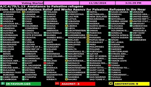 كما وافقت اللجنة على مشروع قرار بشأن “تقديم المساعدة إلى اللاجئين الفلسطينيين، الوثيقة A/C.4/79/L.13))، بتصويت مسجل بأغلبية 165 صوتاً مقابل 3 أصوات ضد، وامتناع 9 دول عن التصويت.