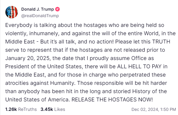 وأكد أن المسؤولين “سيتعرضون لضربة أشد مما تعرض له أي شخص آخر في تاريخ الولايات المتحدة الأميركية الطويل والحافل”، مضيفاً باستخدام الأحرف الكبيرة تعبيراً عن الغضب والصراخ “أطلقوا سراح الرهائن الآن”.