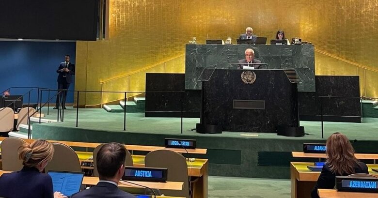 كذلك أشار منصور إلى قيام الجمعية العامة يوم أمس بالتصويت بأغلبية ساحقة لصالح إنهاء الوجود الإسرائيلي غير القانوني في الأرض الفلسطينية المحتلة ولصالح مؤتمر دولي رفيع المستوى لتنفيذ قرارات الأمم المتحدة خصوصا تلك المتعلقة بالتسوية السلمية لقضية فلسطين وحل الدولتين، وأكد على أن تحقيق الشعب الفلسطيني لحقوقه غير القابلة للتصرف، بما فيها تقرير المصير والعودة، وتحقيق استقلال دولة فلسطينية ذات سيادة على حدود عام 1967، وعاصمتها القدس الشرقية، هي السبيل الوحيد لتحويل منطقتنا، وأن التوصل الى سلام في منطقتنا يمكنه المساهمة في تحويل عالمنا.