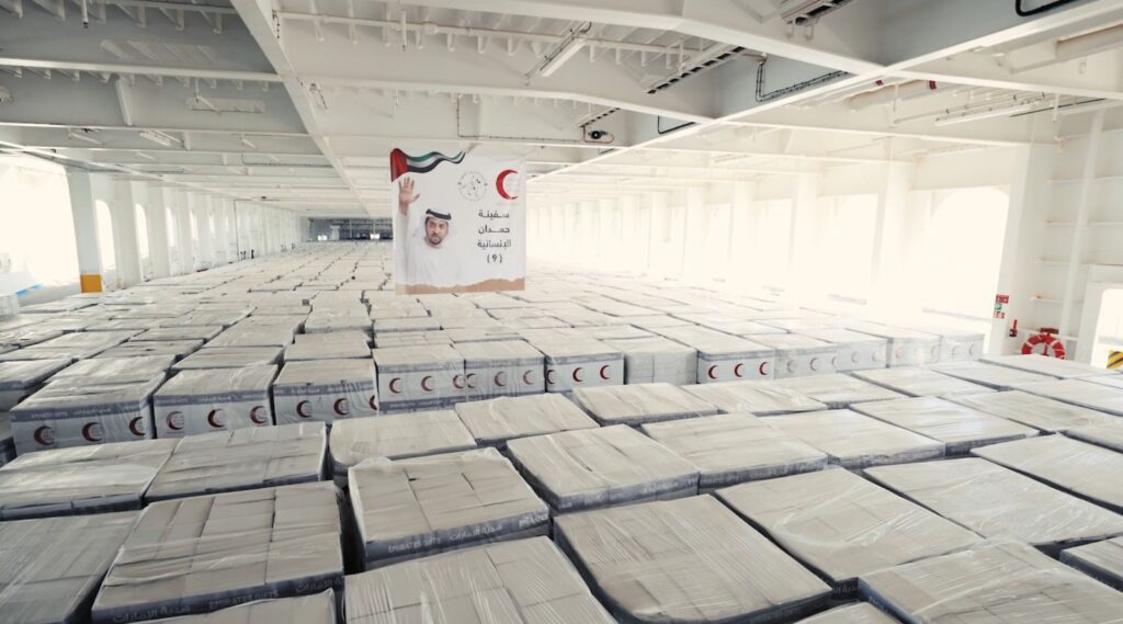 وبتوجيهات من سمو الشيخ حمدان بن زايد آل نهيان، ممثل الحاكم في منطقة الظفرة، رئيس هيئة الهلال الأحمر الإماراتي، جرى تجهيز هذه السفينة التي تتضمن 7000 طن من المساعدات الغذائية والطبية والإغاثية المتنوعة،التي سيتم إدخالها إلى القطاع للمساهمة في التخفيف من المعاناة التي يعيشها سكان القطاع، وتضم الحمولة 5000 طن من الطرود الغذائية، و1900 طن من المواد الغذائية المخصصة لدعم المطابخ الشعبية، و100 طن من الخيام الطبية لتعزيز القطاع الصحي، إضافة إلى 5 سيارات إسعاف مجهزة.