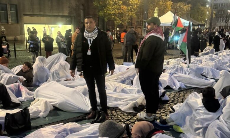 وشملت التظاهرة مسرحية تجسد مشهدا يحاكي تعذيب الاسرى الفلسطينيين إضافة لمشهد الاكفان كشاهد على حجم الابادة الجماعية حيث كان مشهد الاكفان هزة لضمير الاوساط الالمانية .