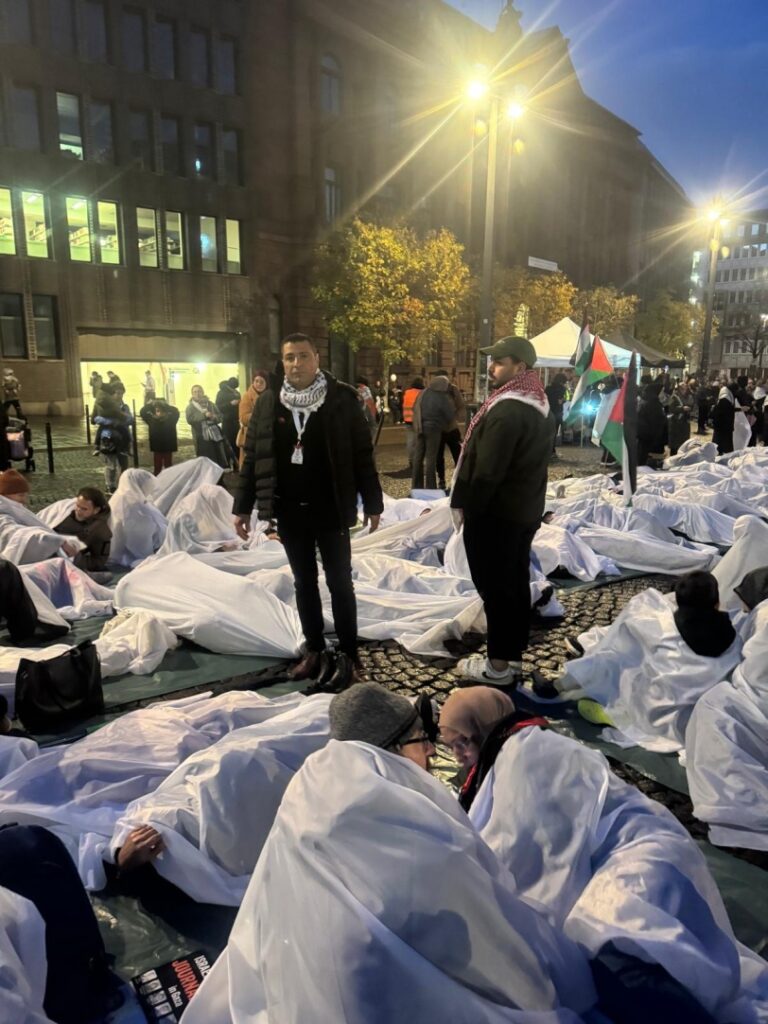 وشملت التظاهرة مسرحية تجسد مشهدا يحاكي تعذيب الاسرى الفلسطينيين إضافة لمشهد الاكفان كشاهد على حجم الابادة الجماعية حيث كان مشهد الاكفان هزة لضمير الاوساط الالمانية .