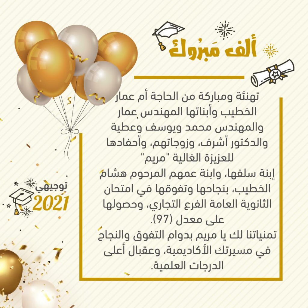 تمنياتنا لك يا مريم بدوام التفوق والنجاح في مسيرتك الأكاديمية، وعقبال أعلى الدرجات العلمية.