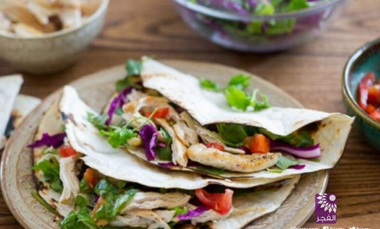 يقطع الدجاج الى شرائح، وتوضع داخل رقاق التورتيلا وترص مع خليط الملفوف، والجرجير، وأي طبقة أخرى .