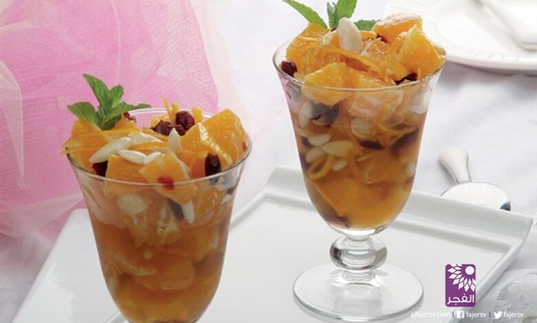 تخلط مكعبات البرتقال مع قطر السكر وعصير البرتقال واللوز والصنوبر. يضاف التوت المجفف.