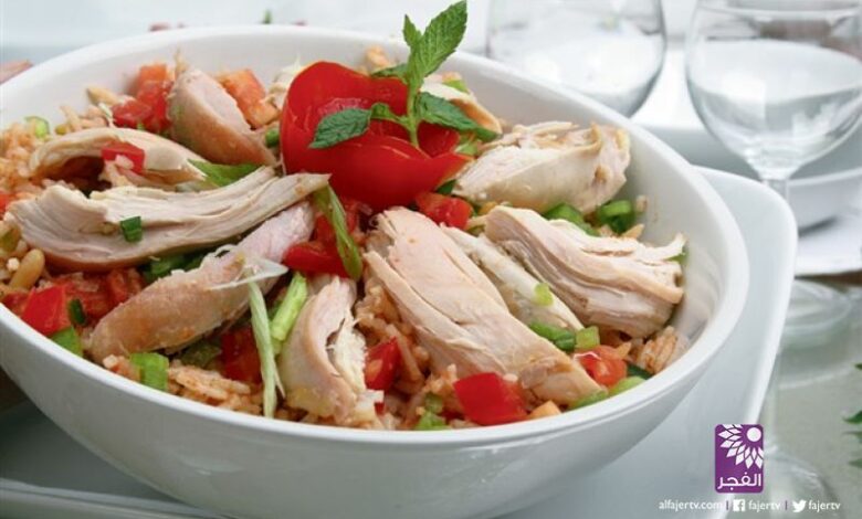 يسكب الأرز في طبق التقديم وتوزع فوقه قطع الدجاج.
