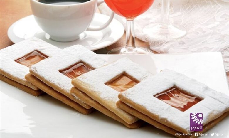 تلصق مربعات البسكويت المدهونة بالمربى مع المربعات المفتوحة في وسطها.