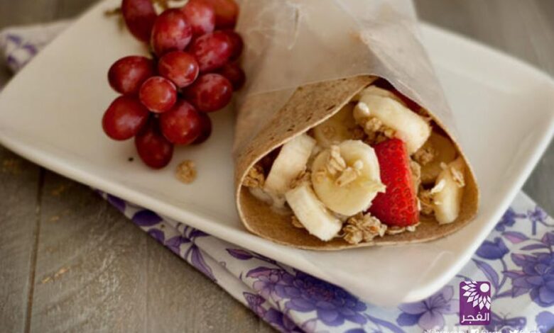 يفرد خليط الجبن على لفائف التورتيلا مع ترك حافة صغيرة. يقسم الموز والفراولة على الرقاق بدون تدكيس. تلف الرقائق ثم الشد قدر الامكان.