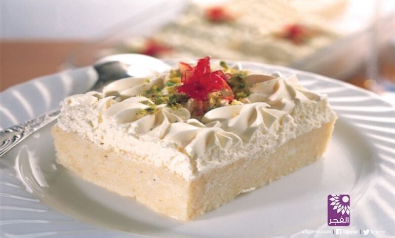 توضع القشدة الجاهزة (دريم ويب) مع القشدة والحليب في الخلاطة الكهربائية ويخفق الكل معاً حتى يصبح المزيج كثيفاً.