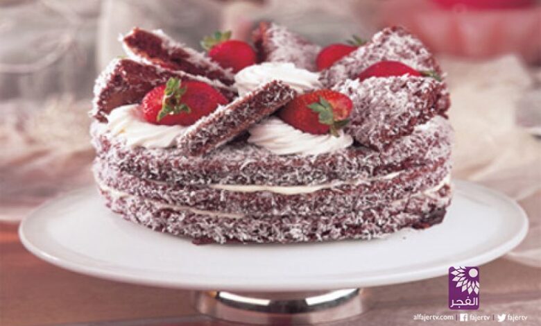 تدهن طبقة الشوكولا فوق كل الغاتوه ويرش فوقها جوز الهند بالتساوي.