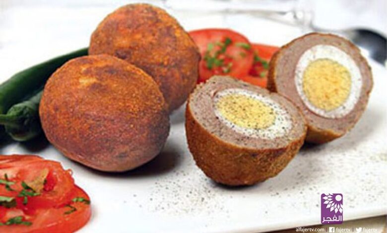 – يوضع البيض المسلوق في وسط اللحمة بشكل خط مستقيم ، ثم تلف اللحمة و تسوى حتى تصبح كشكل مرقاق العجين و يمكن الاستعانة ببعض الماء لتسوية اطراف اللحمة .