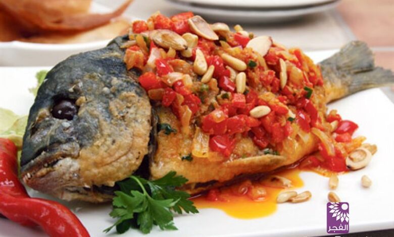 المقادير – سمكة هامور أو جربيدي وزنها 1.5 إلى 2 كلغ – رأس فليفلة حمراء، مفروم ناعماً