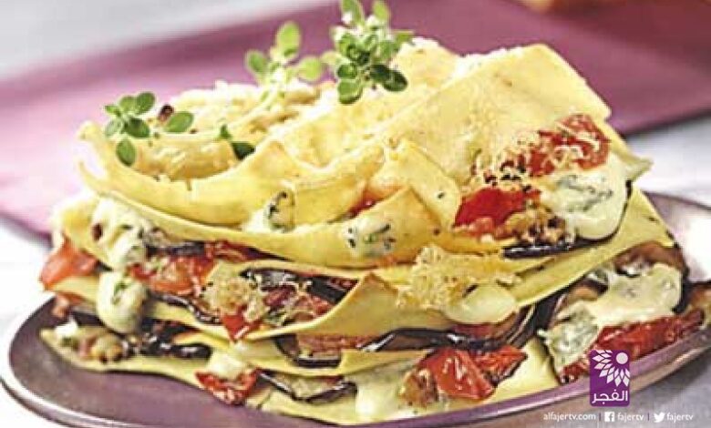 المقادير:- 12 ورقة لازانيا- حبتا باذنجان- 100 غ جبن البارميزان- 250 غ من الجبن الأزرق- مزيج ملعقتين كبيرتين من الزعتر الطري والأوريغان- 20 سل من مرق الخضر- 4 ملاعق كبيرة زيت زيتون- ملح + إبزار- حبتا الطماطم*