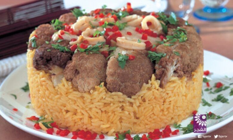 يقطع رأس القنبيط إلى قطع صغيرة.يحمى مقدار كاف من الزيت في قدر عميقة وتقلى فيه قطع القنبيط حتى تصبح ذهبية اللون. ترفع قطع القنبيط بواسطة ملعقة ذات ثقوب وتصفى فوق محارم المطبخ الورقية.يرمى قسم من الزيت ويحتفظ بالقسم الآخر لقلي شرائح السمك ودوائر الكالاماري أو القريدس. ترفع القطع المقلية بواسطة ملعقة ذات ثقوب وتحفظ فاترة. ويستعمل الزيت نفسه أيضاً لقلي البصل والثوم. يخلط البصل والثوم مع القنبيط وثمار البحر.لتحضير الأرز، يغسل كوبان من الأرز البسماتي ويوضعان في قدر مع كوبين ونصف الكوب من الماء، إضافة إلى مسحوق الكاري والزعفران والكمون والفلفل الأحمر. يطهى المزيج على نار خفيفة حتى يغلي ويمتص الأرز كل الماء.يترك الأرز مغطى ليرتاح ٢٥ إلى ٣٠ دقيقة ثم يضاف إليه الملح.يدهن قعر قالب تشيزكايك قطره ٢٤ سم بالزيت ويصف فيه قسم من قطع القنبيط وثمار البحر المقلية.يسكب فوقها الأرز ومن ثم المزيد من قطع القنبيط وثمار البحر، وأخيراً طبقة من الأرز. يضغط على محتوى القالب جيداً، ثم يقلب رأساً على عقب ويزين بالبقدونس والفلفل الأحمر.