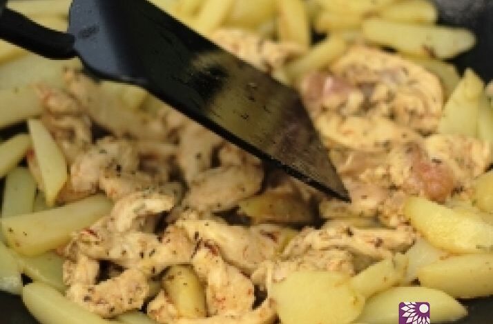 نتبل الدجاج بالثوم وبهار الباربيكا والملح والفلفل الاسود والليمون والخل وبنتركها نص ساعة بالثلاجة، ونضعها بصينية الفرن ونضيف نص كمية البطاطا