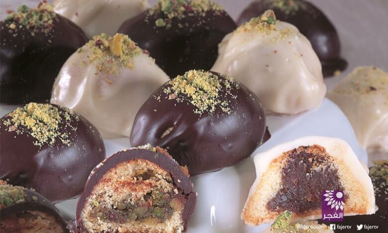تكرر العملية نفسها مع قطع المعمول المحشوة بالتمر ويرش فوقها الفستق الحلبي.