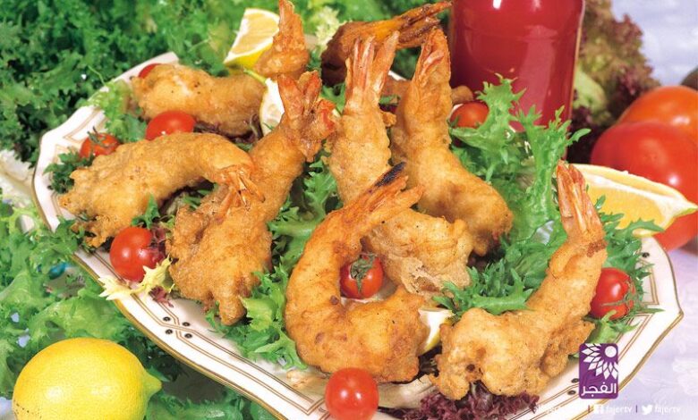 تغمس قطع الجمبري المقلية مرة أخرى في مزيج الدقيق وتقلى مجدداً في الزيت الساخن لتقدم بمثابة نوع من المقبلات مع سلطة لذيذة.