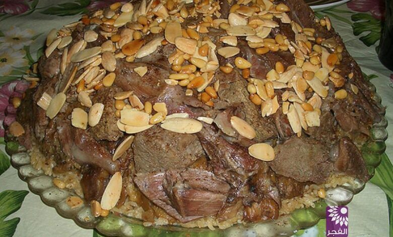 6- يوضع الأرز المنقوع فوق الخليط ويغمر بمرق اللحم الساخن ويترك على النار الهادئة حتى ينضج .