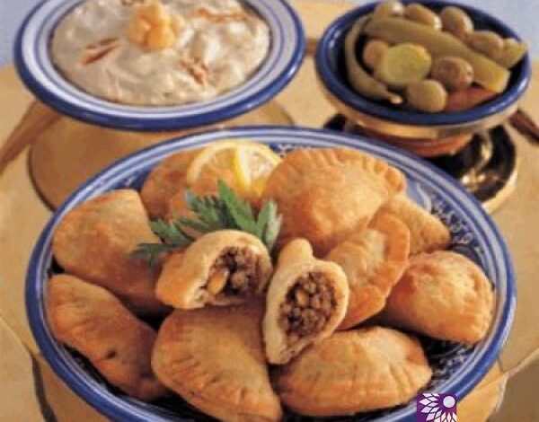 – توضع ملعقة كبيرة من الحشوة في وسط كل قطعة وتُغلق الأطراف من خلال قلب الأطراف أو رصّها بواسطة شوكة.