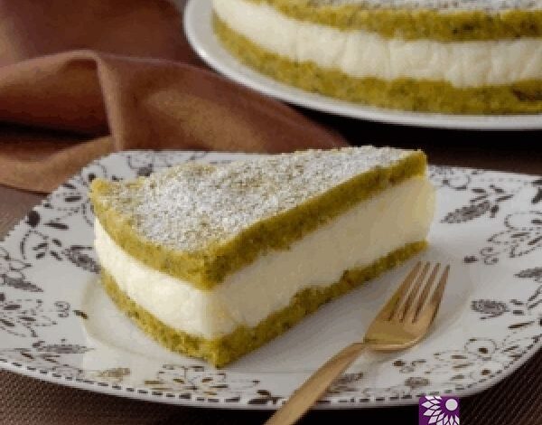 لإكمال الوصفة، يُغلّف قالب الكعكة قياس 26 سم بورقة بلاستيكية تغطّي الزوايا وتنسدل من الأطراف. توضع إحدى كرات الفستق والسميد في قاعدة القالب وتُضاف القشطة المبرّدة وتوضع فوقها الكرة المتبقية. توضع في البرّاد لمدّة 4 ساعات قبل التقديم ويُرشّ السكّر البودرة على الوجه.
