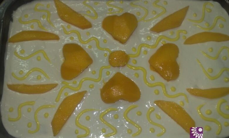 نضع بين الطبقات مانجو مقطعة مكعبات صغيرة