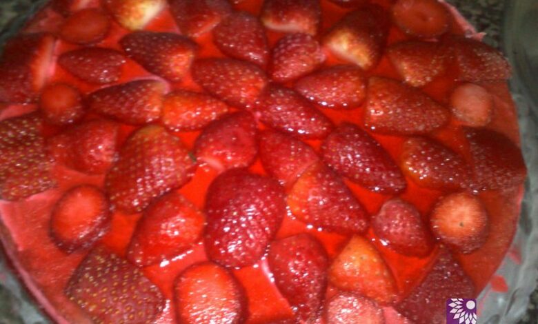 بعدها نقوم بتجهيز بكيت الجلي الثاني ونضعه برفق فوق حبات الفراولة وتوضع بالفريزر لمدة ساعتين