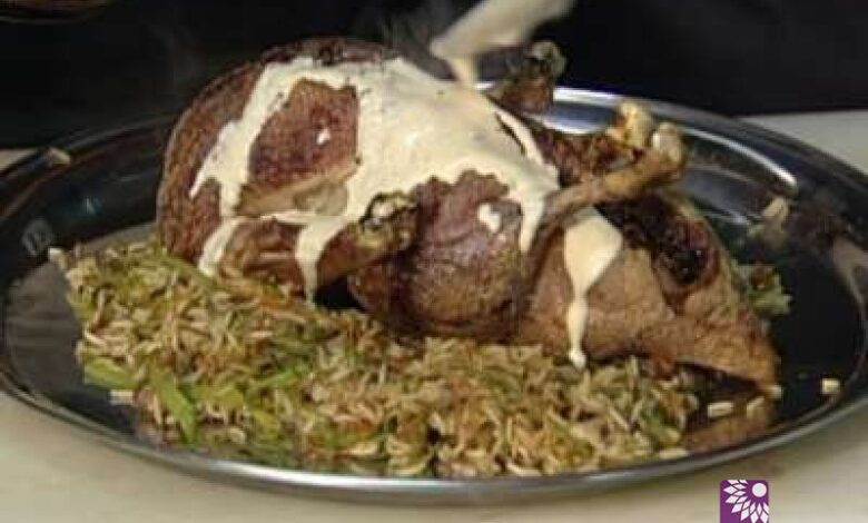 نخرج البطة من الفرن، ونضعها في الصحن وإلى جانبها ما تبقى من الخضار مع الرز، ثم نصب المرق فوقها. وتؤكل بالف هنا وشفا