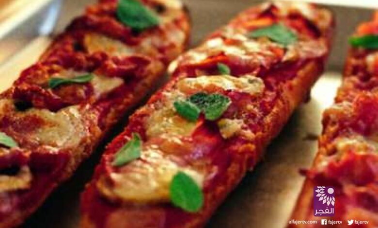 تبسط شرائح البيتزا في صينية الخبز وتشوى لمدة 5 دقائق حتى تذوب الجبنة وتصبح ذهبية.